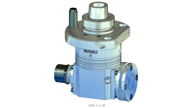 G06-1.2 系列角頭具有帶兩個刀架的連續加工主軸。這意味著兩個刀架之一的主軸旋轉方向與驅動旋轉方向相同,另一個刀架的主軸旋轉方向與驅動方向相反。驅動速度以 1:1.55 的比例傳遞到刀架。間歇運行時主軸最高轉速可達 20,000 rpm。